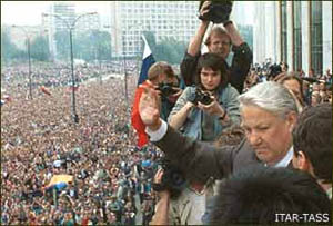 President Yeltsin addresses tens of thousands of people at a huge rally at the White House.