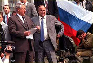 Russian President Boris Yeltsin climbs on a tank and calls on the army, the police and all members of the KGB to switch allegiances.